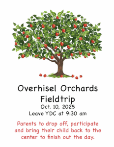 All students must be transported by their families due to licensing rules on our center’s ability to transport children. We ask that all families fill out the participation forms by Oct. 9th so we know how many chidlren will be on the field trip and how many children will remain in the center during the hours of the fieldtrip.