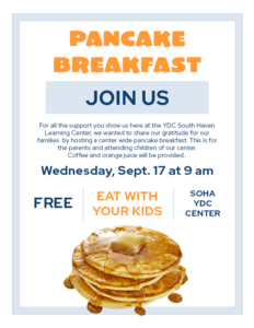 Come and eat with your children in the center on Sept. 17th from 9-10. We will be serving Bob’s Processing sausages, pancakes, OJ and hot coffee. If you can’t stay because you have to run to work, we have to go containers for you.